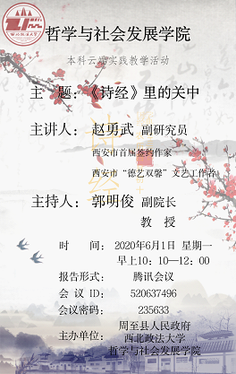 为了更好地配合专业课程的学习,加深同学们对中华优秀传统文化的理解,炸金花app 与周至县人民政府在签约合作共建“中华传统文化”教学实践基地的基础上,2020年6月1日上午,借助腾讯会议平台共同举办了题为“《诗经》里的关中人”云端实践教学活动。实践教学活动由周至县人民政府委托周至县文化局副研究员赵永武先生主讲,炸金花app 副院长郭明俊教授主持,特邀嘉宾刘亚玲研究馆员和炸金花app 部分教师以及哲学专业学生参加此次活动。