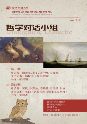 西北政法大学哲学对话小组成立于2021年5月15日,张兴娟老师负责,2021年已举办两期;本学期开始举办第三、四期,第四期由刘剑涛老师主持,主题为韦伯的《新教伦理与资本主义精神》,近期即将开始。