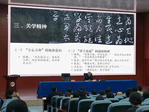 张荣刚副校长对报告进行总结,他说,赵馥洁教授的讲座内容丰富,哲理深刻,作为中华优秀传统文化的重要组成部分,关学的智慧和精神不仅教会我们如何做一个好人,更教会我们如何将为学与为人做到有机统一,希望广大师生勤于治学、研学,在日常生活、学习中将关学精神发扬光大。