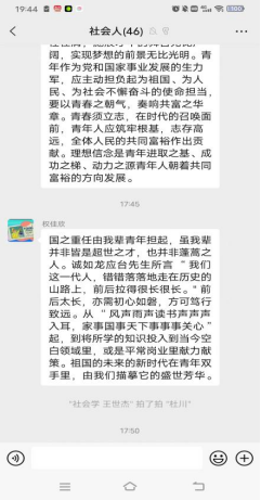 此次《以青春之我,承时代之任》主题团课受疫情影响采用线上方式进行,由我团支部副团支书刘珂欣组织开展,分为四个板块进行学习:1.奋进新征程,建功新时代;2.青年兴则国家兴,青年强则国家强;3一代人有一代人的使命,一代人有一代人的担当;4.未来属于青年,希望寄予青年。会议结束后在群内组织了此次团课的感悟分享,社会学班同学都积极发言,分享心得体会。