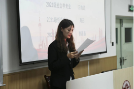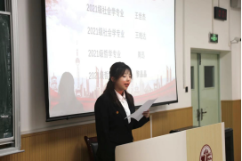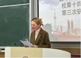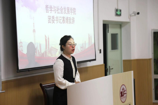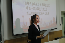 团委书记慕婧致辞,她首先向大会的召开表示热烈的祝贺,其次向学生代表们寄语,希望代表们能够坚定中国特色社会主义信念,不断追求卓越;坚持从同学中来到同学中去的理念,加强自己服务同学的能力;用实践深化制度改革,让学生会成为一个有效率、有温度的组织;她鼓励同学们在新时代青春征程上,以精益求精的态度躬身实践,谱写新时代中国特色社会主义更加绚丽的华章。