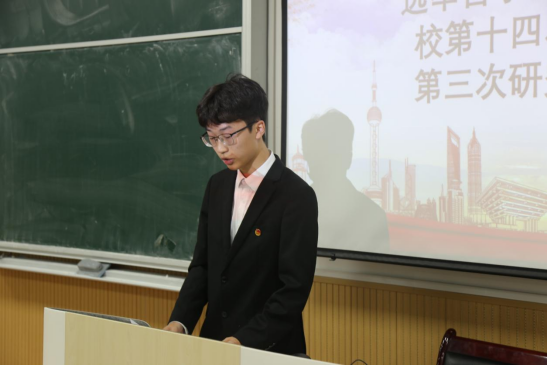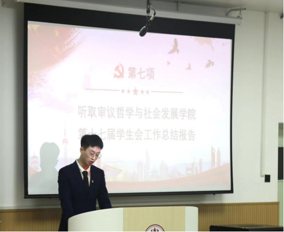第十七次学生会主席团成员方凯旋进行了工作总结,充分肯定学生会在过去一年多的工作成果,同时指出在工作中的不足,希望大家能在今后的各项工作中加强团队协作与沟通能力,凝聚共识,更好地为广大师生服务。