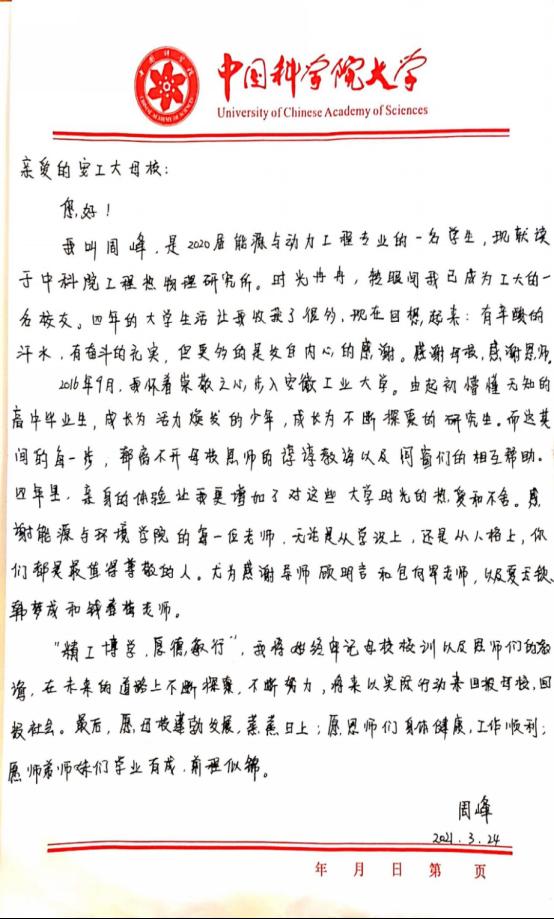 工程热物理研究所攻读硕博研究生。他用行动展现了有梦就去追的可贵精神,为低年级学生树立刻苦勤奋、奋发向上的榜样典型。(附:周峰写给母校的信)