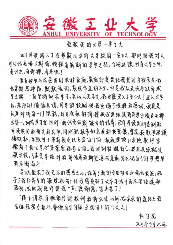 领导和老师的关怀鼓励下,凭借顽强的意志及积极进取的心态,何自龙同学于2022年保送至北京大学攻读硕士研究生。(附:何自龙写给母校的信)