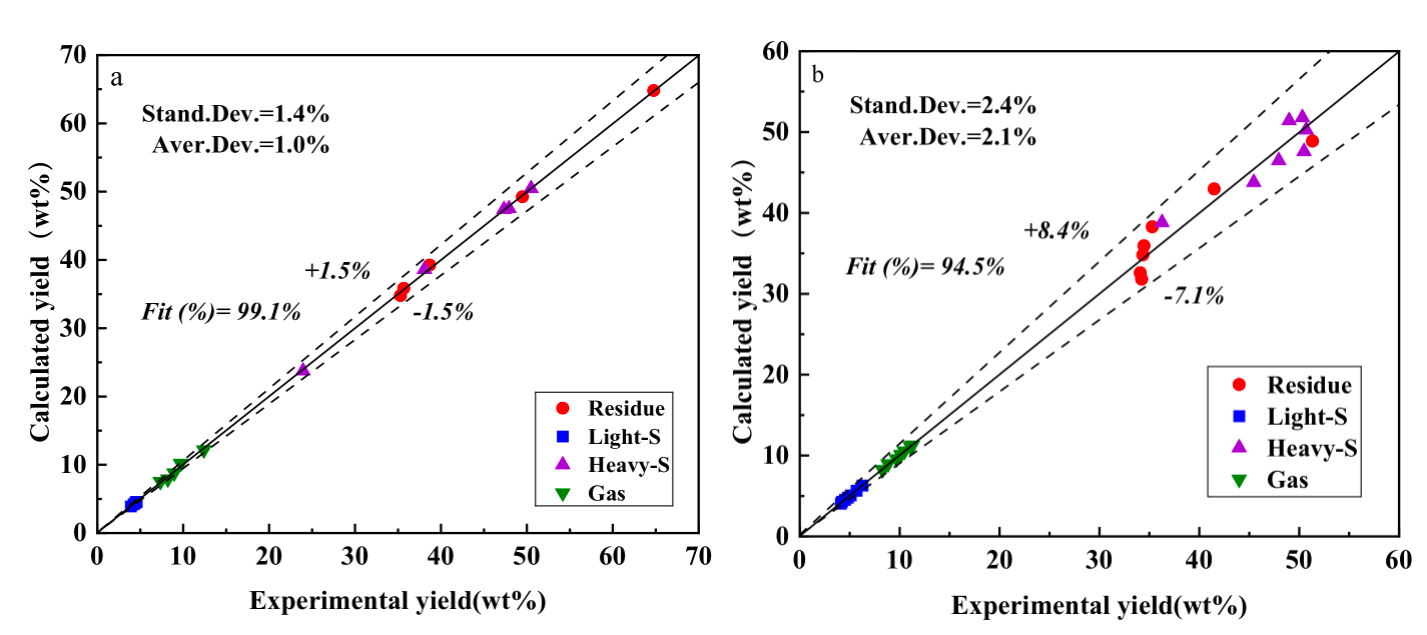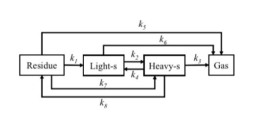 根据集总动力学对热溶萃取建立了反应模型,并基于以下假设构建了数学微分方程。(1)假定所有反应都是准一级反应。(2)假设质量传递、粒径小和其他因素对反应的影响可以忽略不计。(3)假设所有速率常数都可用阿伦尼乌兹定律描述。