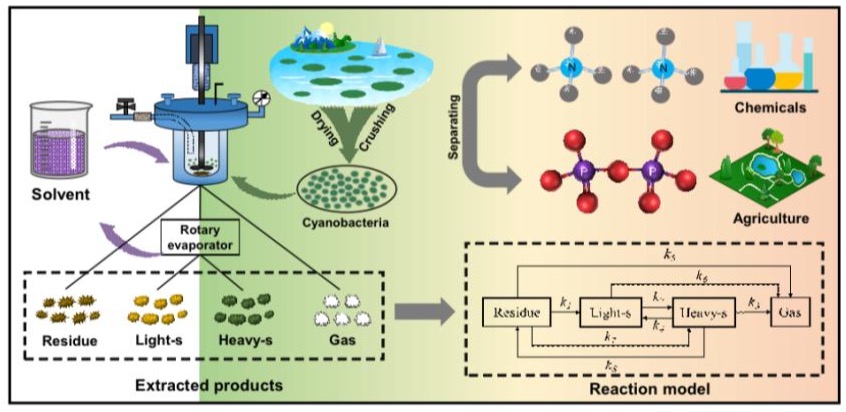 蓝藻因为其光合效率高,生物量大,固定氮磷的能力强,成为新一代理想原料。蓝藻中富含氮、磷、钾等元素,因此在制备生物肥料、含氮杂环化学品等方面具有巨大利用潜力。高价值的含氮化学物质通常可以通过蓝藻的热解获得。然而,在热解中催化剂很容易被蓝藻的高磷含量中毒失活。磷对生物体至关重要,是多种农业和工业产品的重要组成部分。因此,团队提出了热溶萃取方法实现蓝藻高效分离氮磷,这为蓝藻的资源化利用提供更多途径。