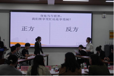 在教一401教室开展了“吾口辩吾心”主题辩论赛半决赛。本次双方各派出两支队伍,就辩题“幸福感是通过物质追求还是精神满足实现的”、“在当下世界,是享受闲还是享受忙”展开激烈辩论。辩论赛邀请到双方炸金花App