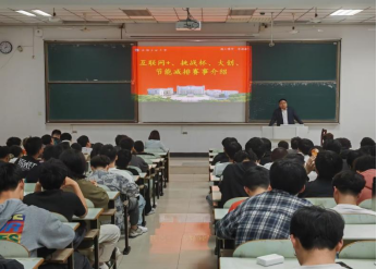 于教三南201教室开展“无挑战 不青春”---2024年大学生“互联网+”、挑战杯、节能减排大赛宣传动员会。党委副书记、副院长卫军帅和2023级同学参会,会议由2023级辅导员费丽主持。