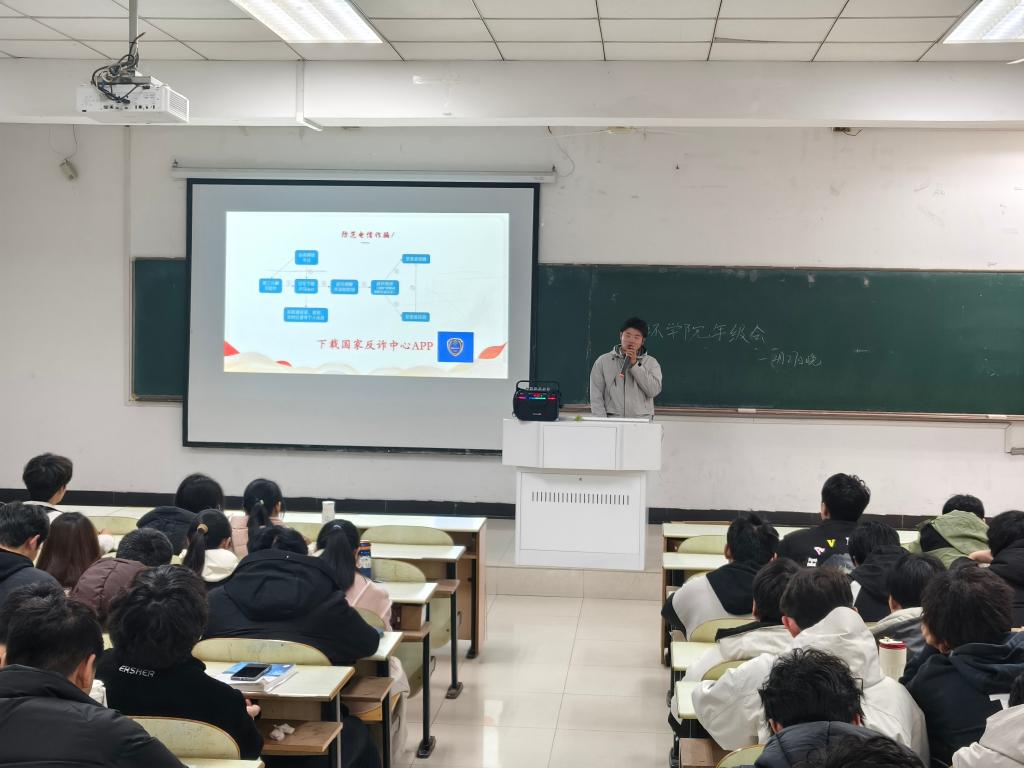 会上,范浩东首先就上学期学生考试成绩进行详细分析,对学风、班风、宿风建设成果开展系统总结。他强调学风建设必须常抓不懈,好的班风和宿风的养成也需要所有同学的共同努力。同时,针对有补考的学生,他要求一是充分复习、坚定信心,二是严守底线、诚信考试。紧接着,他结合大量实际案例,向学生进一步强调了要防范电信诈骗、重视交通安全以及做好宿舍防火等方面。最后,针对近期DeepSeek的问世和动画电影哪吒的爆火,他与学生展开了深入的讨论。要求学生们能够正确看待DeepSeek的工具属性,避免过度依赖,保持理性思考。从电影中体会技术创新与传统文化的结合,从剧中人物身上学会如何面对偏见与挫折,帮助自己在人生道路上走得更加坚定和自信。