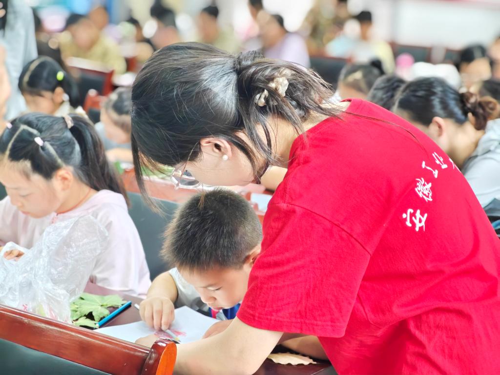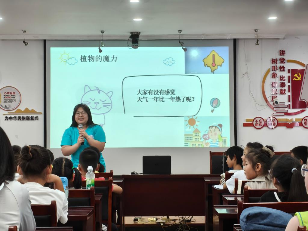 在创作结束后的互动交流环节,孩子们踊跃分享感受,纷纷表示要爱护花草树木,让地球更美丽。实践队队员肯定并鼓励他们的想法,还引导思考日常环保行动,孩子们积极响应,承诺从自身小事做起保护环境。