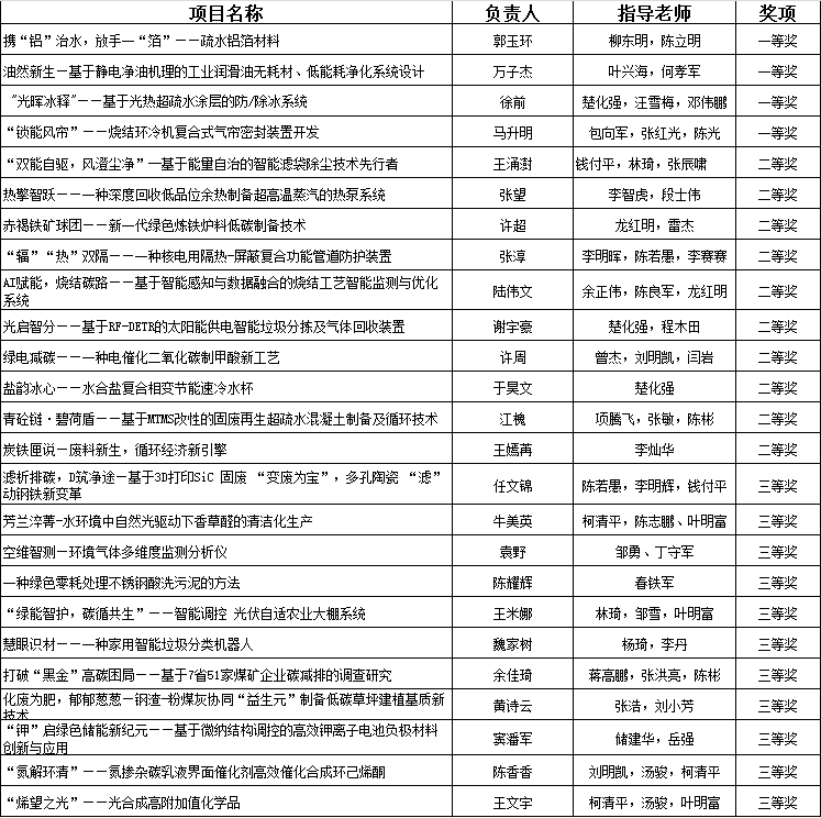 其中,《携“铝”治水,放手一“箔”——疏水铝箔材料》《油然新生—基于静电净油机理的工业润滑油无耗材、低能耗净化系统设计》2个项目推荐参加国赛,另外参加“焓谷•晶宇杯”第二届安徽省大学生节能减排社会实践与科技竞赛获得一等奖的13个项目也推荐参加国赛。参加国赛具体名单公示如下(排名不分先后):