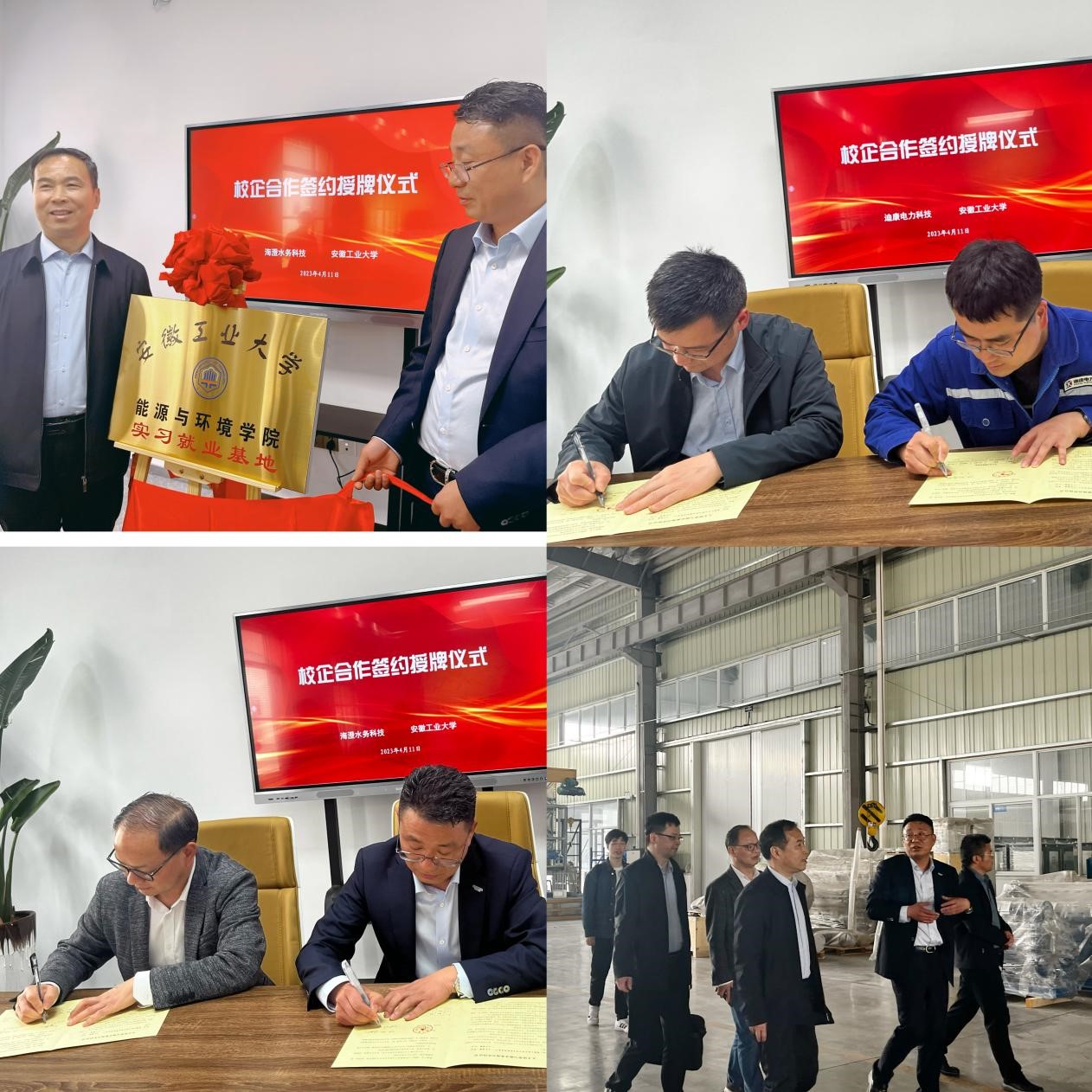 党委副书记谢文平和教学副院长盛广宏分别与四家企业签订了大学生就业基地协议和实习基地协议。与会人员在企业负责人的陪同下一同参观了海澄水务科技集团有限公司和东方日升(安徽)新能源有限公司生产车间。