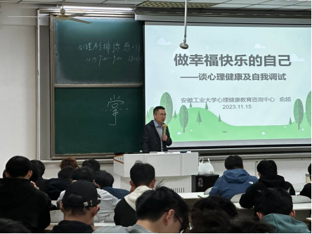 在佳山校区教三南302举办“做幸福快乐的自己——谈心理健康及自我调试”专题心理讲座,学工部副部长、心理中心主任俞超主讲,炸金花App