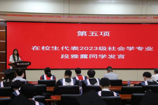 在校生代表2023级社会学专业段雅露同学为学长学姐们表示热烈祝贺,恭喜学长学姐圆满毕业,踏上人生新征程。