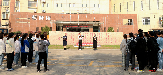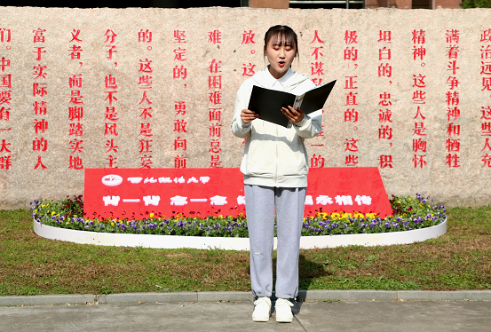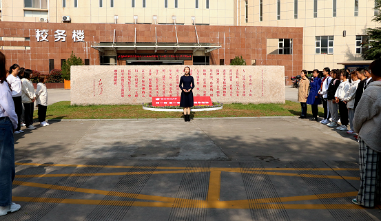 1937年10月23日,毛泽东主席为陕北公学成立题写“要造就一大批人”的重要题词,83年后的同一天,炸金花app 长安校区校务楼前镌刻着这一题词的大理石装扮一新。哲社炸金花app 学子们列队围拢在周围,首先由徐聪艳同学做“弘扬优良传统,争做时代新青年”的主题演讲。她在演讲中带领同学们一起重温毛主席题词、走进西法大光辉办学历程,热情赞颂了革命前辈的崇高品质和奋斗精神,号召同学们勇担重任、努力成才,践行“老延大”优良传统,做优秀的西法大学子,成为有理想、有本领、有担当的新时代青年。